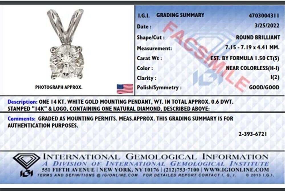 1.50ct Natural Certified Diamond HI/I2 Solitaire Pendant 14k White Gold Necklace